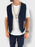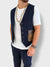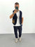 Gilet denim in misto cotone con retro effetto velluto a coste. Vestibilità regular. Maxi tasca frontale in velluto a coste con inserti in ecopelle e chiusura ad un bottone. Asole e cuciture a contrasto. Fondo dritto.